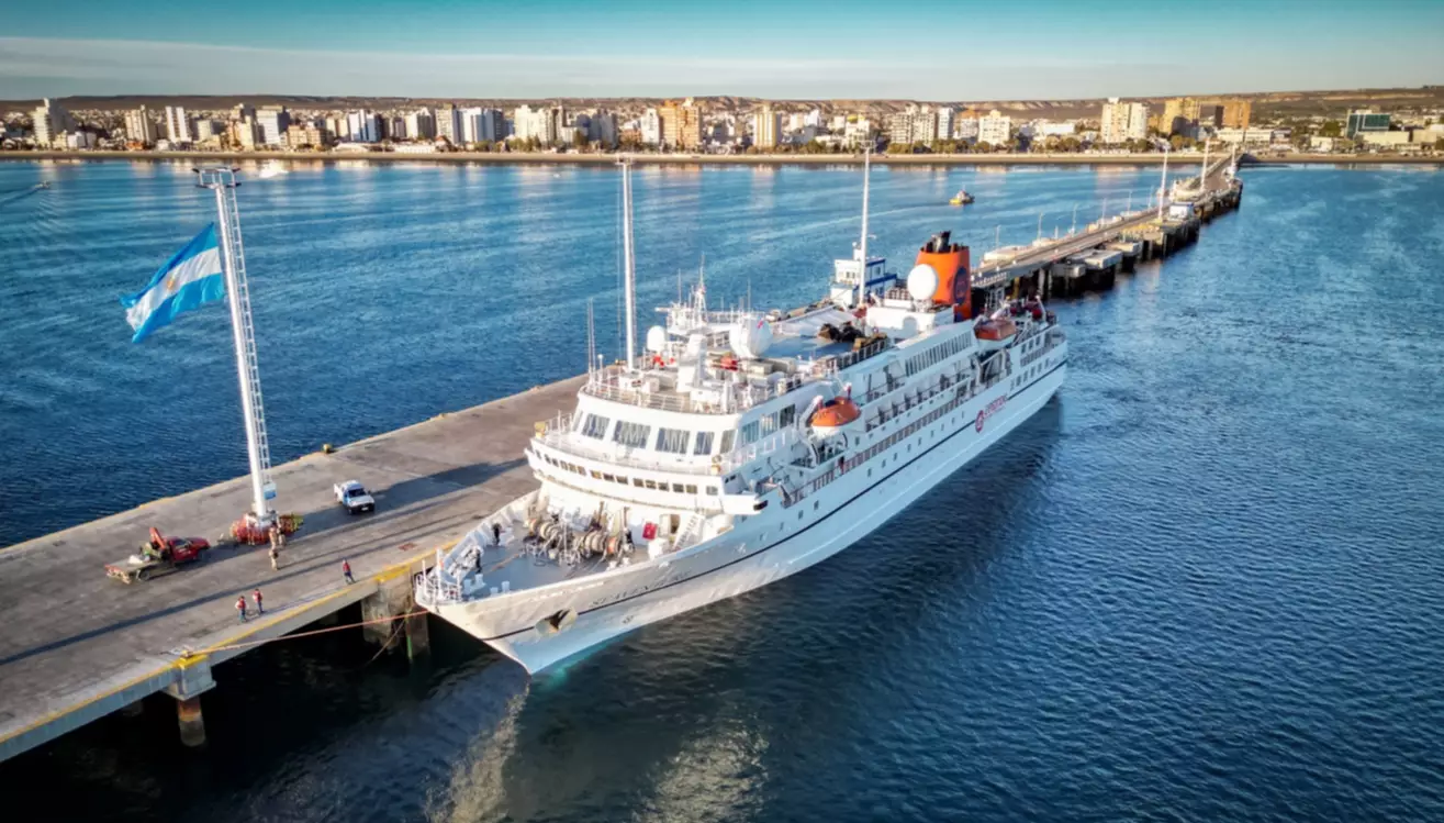 El buque, de 111 metros de eslora y diseñado especialmente para navegar en regiones polares, arribó con 6 pasajeros y 103 tripulantes a bordo, y durante su estadía en la ciudad del Golfo Nuevo embarcará a 103 pasajeros que iniciarán su travesía rumbo al sur. El zarpe está previsto para las 14:00 horas, con destino a Islas Malvinas.