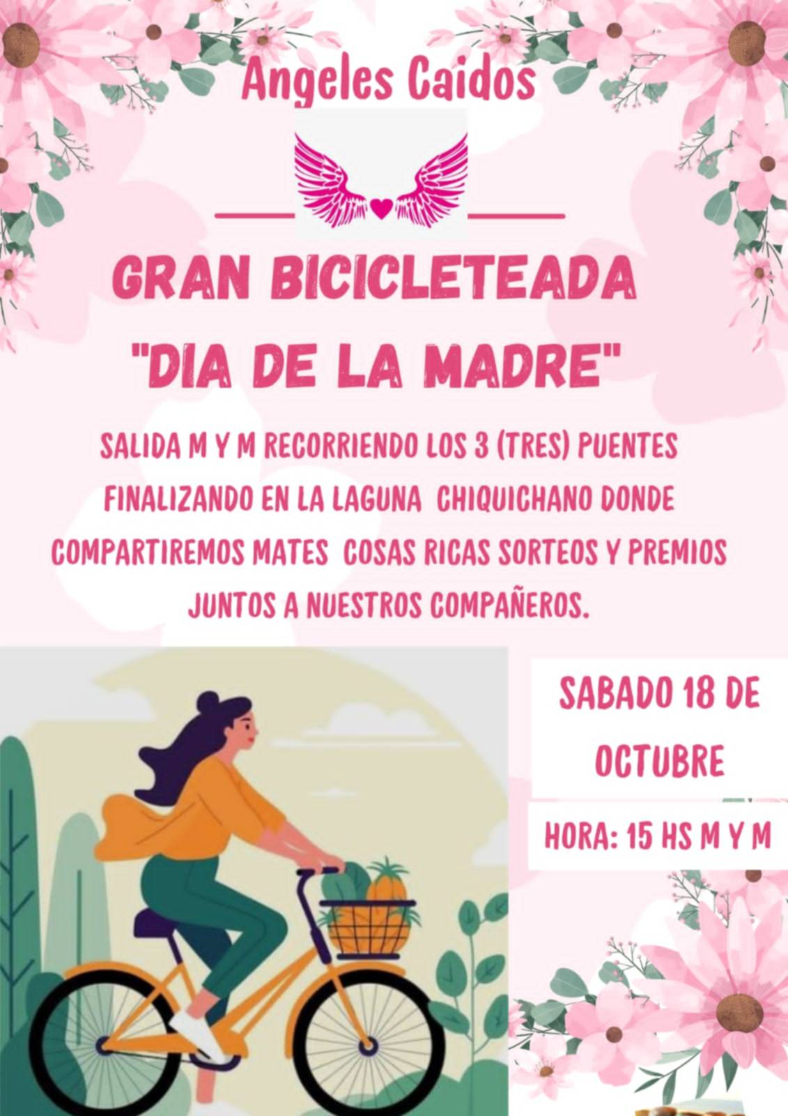 La bicicleteada partirá a las 15:00 desde Capitán Murga y Musters, recorrerá los tres puentes de la ciudad y finalizará aproximadamente a las 16:30 en la Laguna Chiquichano. Allí se esperará a las madres con mates y refrigerios, además de realizar sorteos y entregar premios a los participantes.