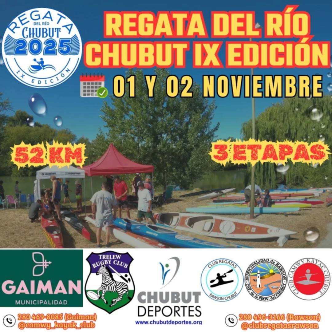 Entre los días 1 y 2 de noviembre, se llevará a cabo la IX Regata del Río Chubut, con la organización de los clubes Regatas de Rawson y Camwy Kayak Gaiman.