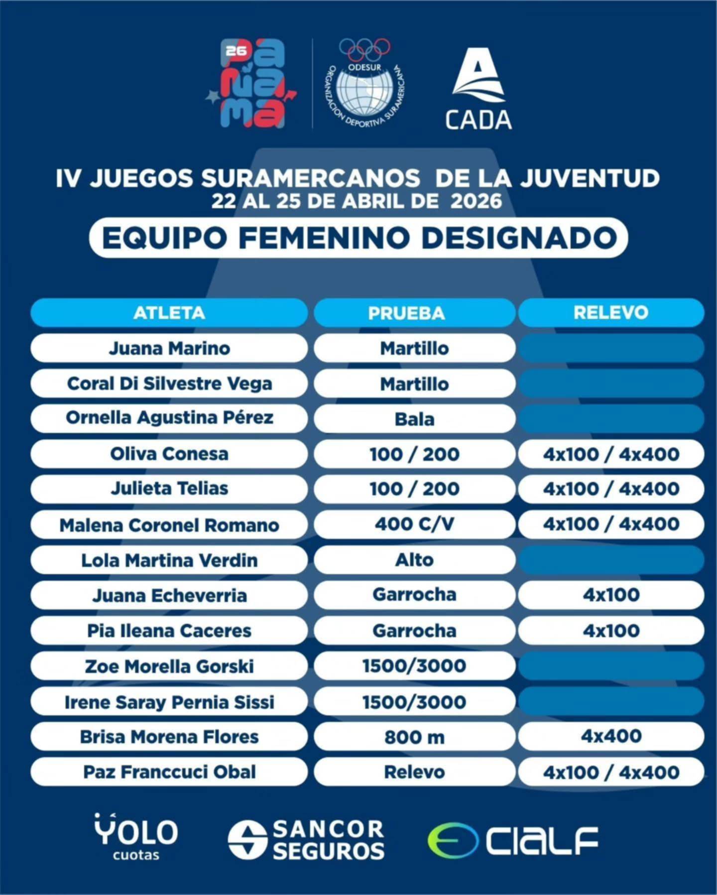 “Luego de haber finalizado el evaluativo realizado los días 7 y 8 de febrero en la ciudad de Mar del Plata, cumpliendo las pautas detalladas en el boletín N° 57/25 designación de equipos Nacionales, la Confederación Argentina de Atletismo tiene el agrado de informar la conformación del equipo nacional que participará en los IV° Juegos Suramericanos de la Juventud, a celebrarse en la ciudad de Panamá entre el 22 y el 25 de abril de 2026, en representación del Comité Olímpico Argentino”, expresa el comunicado oficial.