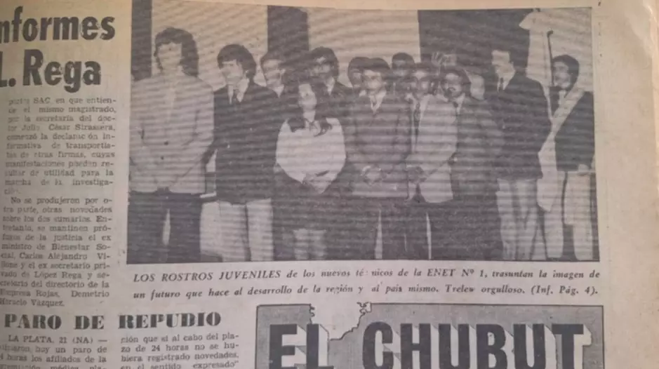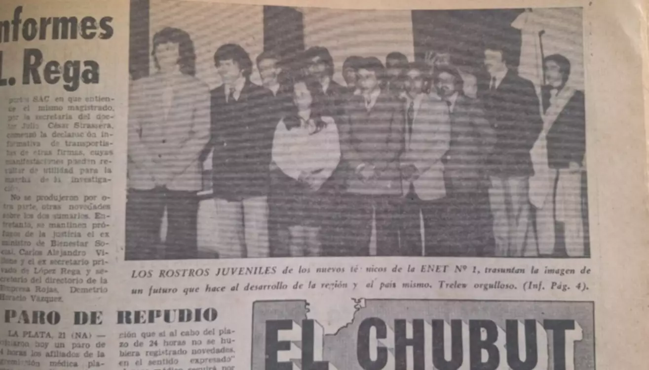 Con gran gala en el Teatro Español, relata la crónica del diario EL CHUBUT, hace medio siglo, un viernes 21 de noviembre de 1975, el calor y el viento patagónico se hacía sentir, sin embargo, la gloriosa ENET Nro 1, comenzaba a gestar la extraordinaria labor educativa de otorgar el título a los primeros Técnicos Mecánicos Electricistas, a los primeros doce legionarios y adalides de la historia educativa de Trelew.