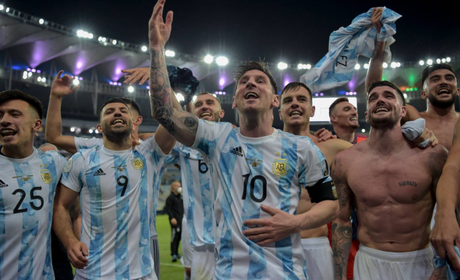 El plantel del seleccionado argentino festejó el título de la Copa América al ritmo de una nueva canción con dedicatoria a Brasil, en la que pondera la "corona" de Lionel Messi y destaca el recuerdo a Diego Maradona.