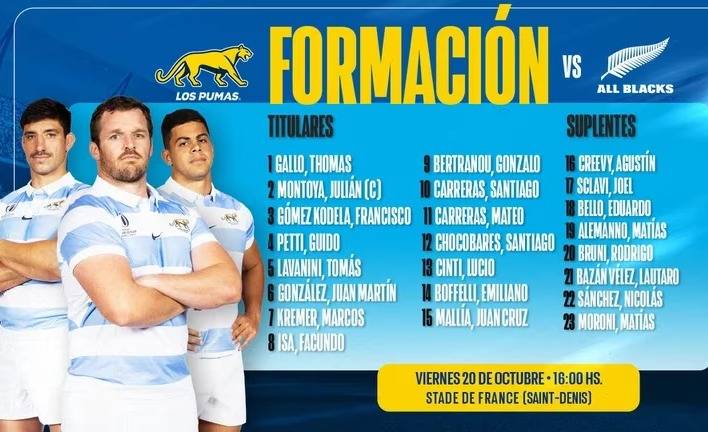 La formación de Los Pumas nucleará entonces a Thomas Gallo, Julián Montoya (capitán) y Francisco Gómez Kodela; Guido Petti y Tomás Lavanini; Juan Martín González, Marcos Kremer y Facundo Isa; Bertranou y Santiago Carreras; Mateo Carreras, Santiago Chocobares, Lucio Cinti y Emiliano Boffelli; Juan Cruz Mallía.