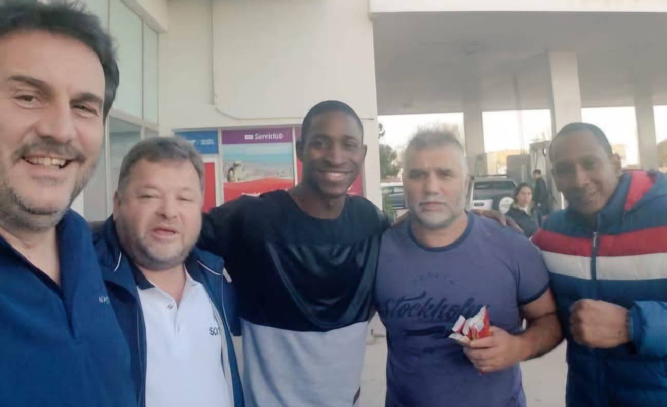 Darío Santos, Omar Rey, William Scull, Jorge Angulo y Franquis Aldama en la estación de servicio de San Antonio Oeste.