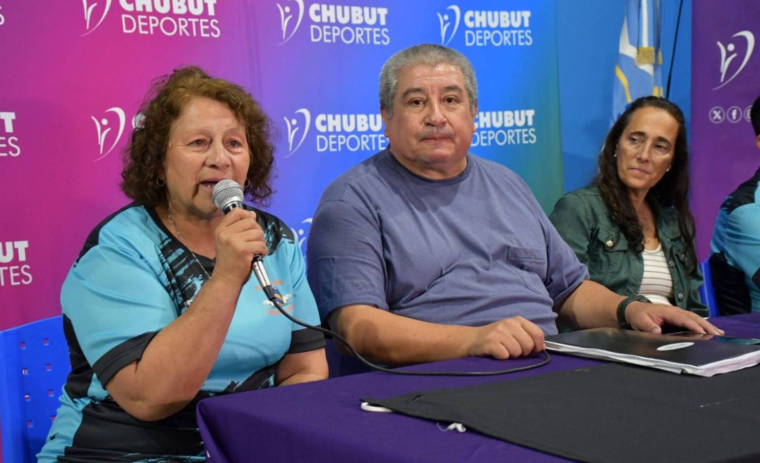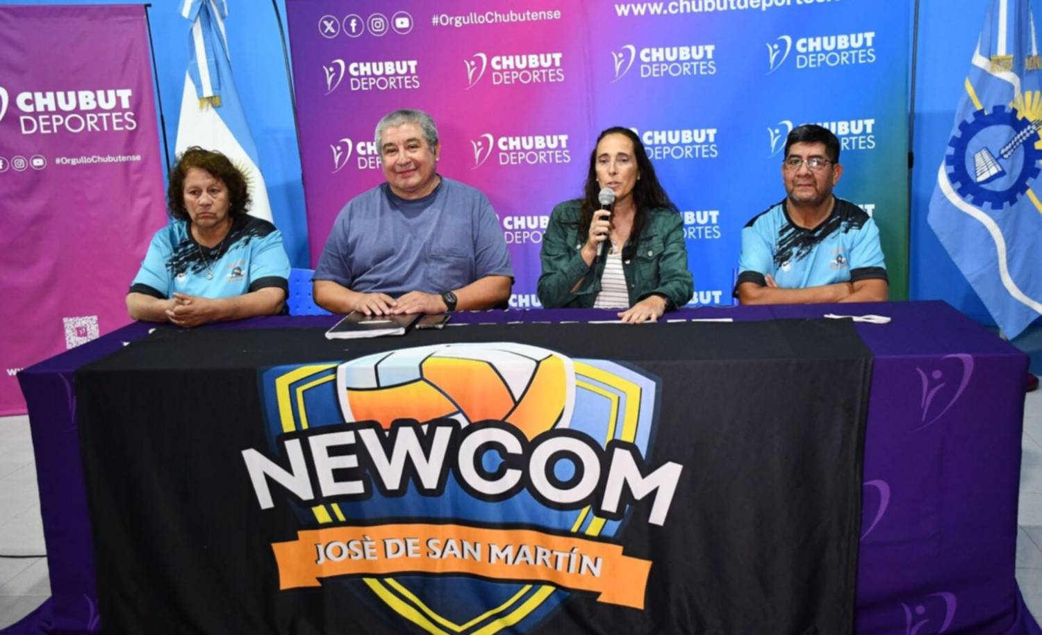 Participaron de la presentación Alejandra Ibrahim, miembro del Directorio de Chubut Deportes y el presidente de la Comisión Municipal de Newcom de José de San Martín, José Teodoro Gómez, junto a jugadoras del equipo “Pioneros” de Rawson.