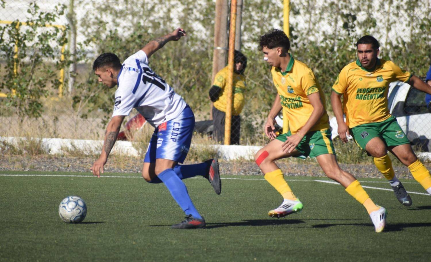 Lautaro Ríos de Defensores del Parque gambeteando la posición del balón ante la marca de Sidem y Lucas Salinas de La Ribera.