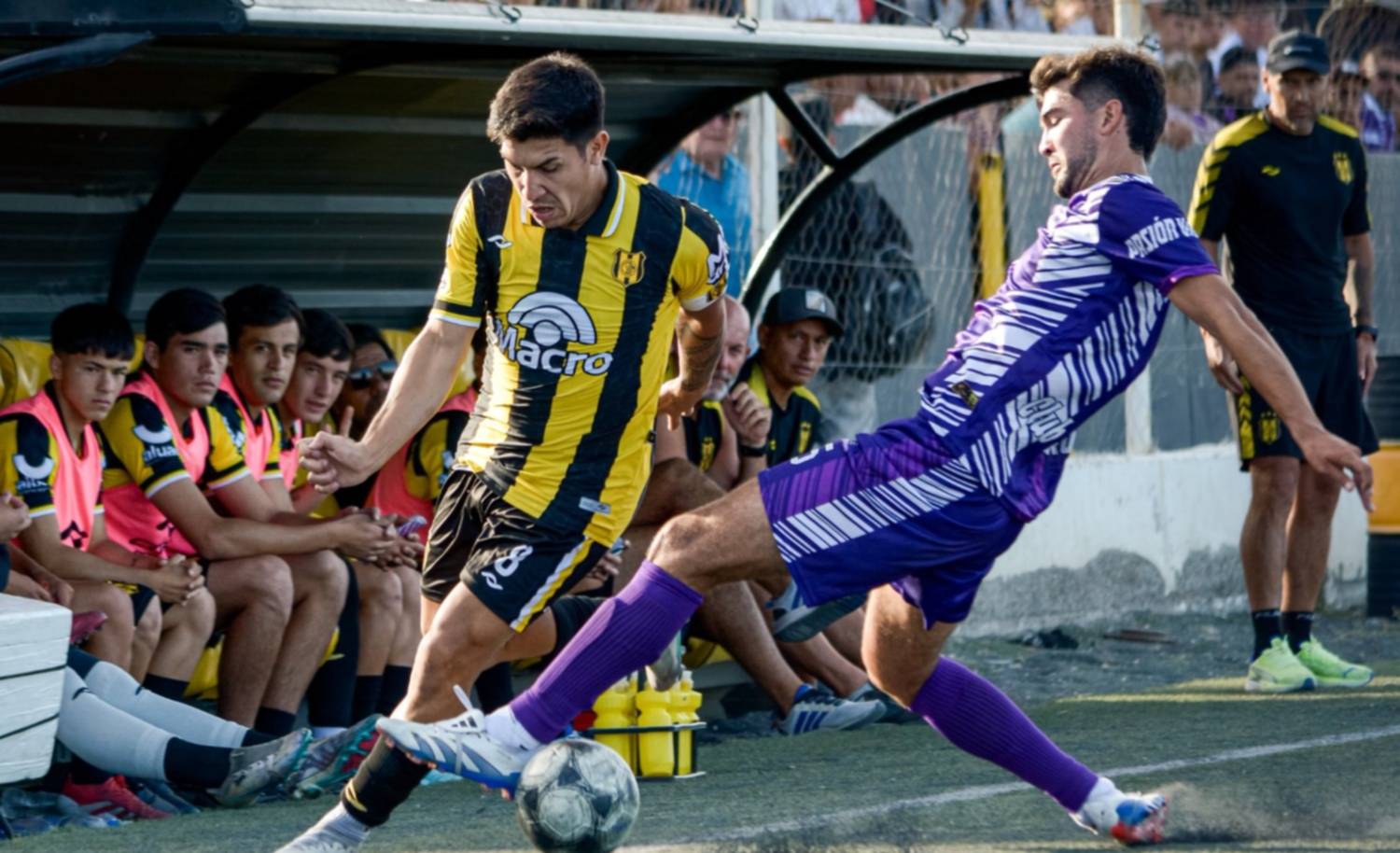 La primera de la visita llegó a los 29 minutos, con una buena jugada individual de Perrotta ante el defensor Lautaro Rivero que terminó en un centro al segundo palo para la llegada del extremo David Zalazar, que remató desviado desde el piso.