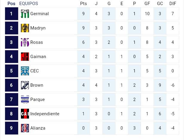 Con estos resultados, Germinal y Deportivo Madryn se ubican en lo más alto de la Zona 1, ambos con 9 unidades, aunque el elenco aurinegro tiene un partido menos; más atrás vienen Rosas, con 6 puntos, y varios equipos con 4 unidades, incluido Brown.