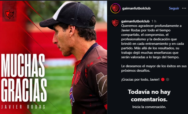 El anuncio fue realizado a través de las redes sociales oficiales del club, donde expresaron: "Queremos agradecer profundamente a Javier Rodas por todo el tiempo compartido, el compromiso, el profesionalismo y la dedicación que brindó en cada entrenamiento y en cada partido. Más allá de los resultados, su trabajo dejó muchas enseñanzas que serán valoradas a lo largo del tiempo. Le deseamos el mayor de los éxitos en sus próximos desafíos".